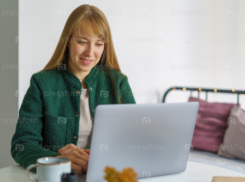Улыбающаяся женщина смотрит на экран ноутбука. Удаленная работа из дома. Социальное дистанцирование на карантине. Девушка учится онлайн в спальне. Уютное рабочее место. Дистанционная работа из дома