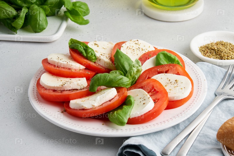 Аппетитный итальянский салат капрезе с нарезанными помидорами, моцареллой, базиликом, оливковым маслом, перцем и солью на белой тарелке. Средиземноморская здоровая свежая закуска. Горизонтальный вид сбоку на деревенскую еду