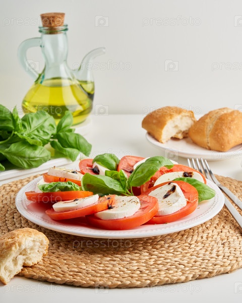 Вертикальный вид сбоку на традиционный итальянский салат капрезе с нарезанными помидорами, моцареллой, базиликом, оливковым маслом, перцем, солью и чиабаттой. Вегетарианская здоровая еда из свежих ингредиентов