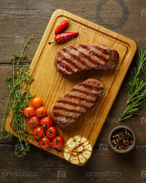 Сочные и нежные два кетогенных бифштекса на деревянной доске с травами и специями