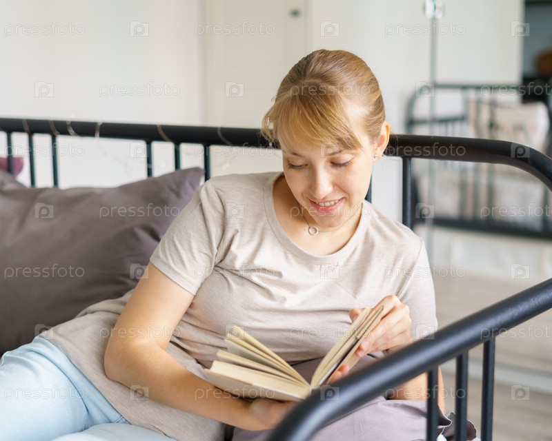 Молодая женщина лежит на кровати и читает книгу. Детокс в социальных сетях и день без гаджетов