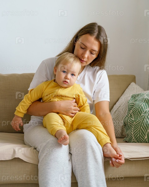 Маленький малыш в желтой одежде сидит на коленях у матери и с любопытством смотрит в камеру