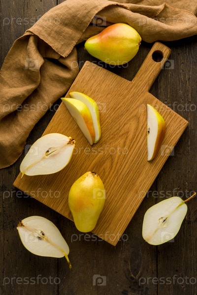 Нарезанные желтые груши на деревянной разделочной доске. Еда фон вертикальный