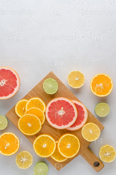Цитрусовая композиция на разделочной доске. Многие половинчатые лимоны, лаймы, грейпфруты. Вертикальный