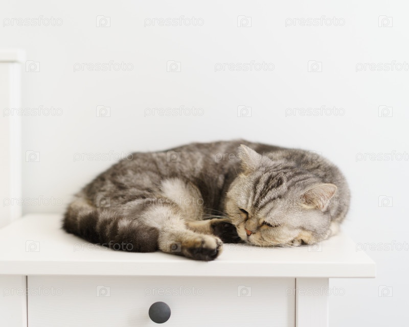 Серый полосатый кот шотландский прямоухий спит на тумбочке возле кровати в белой комнате в скандинавском стиле. Пустое место для текста