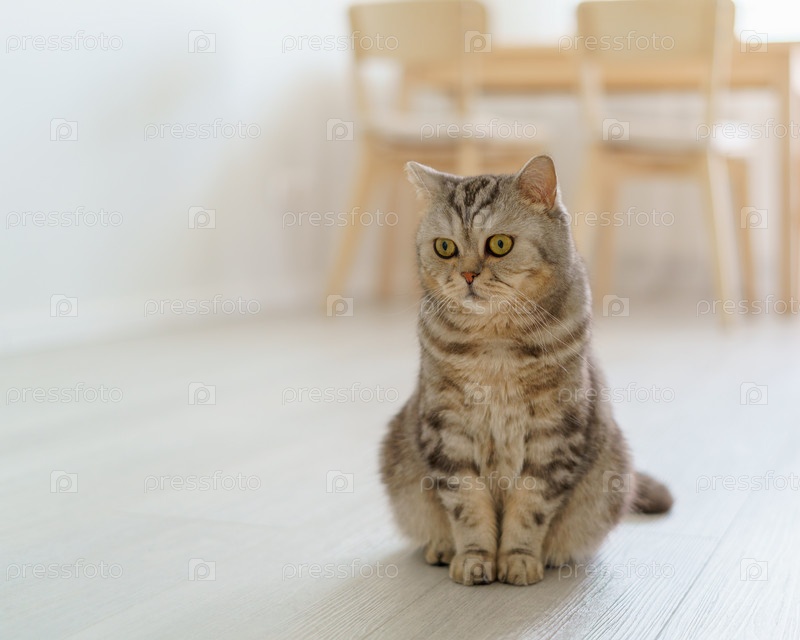 Шотландский голодный кот хочет есть, жалко выглядя котенком, сидящим на полу кухни и ожидающим