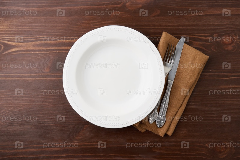Горизонтальная плоская планировка пустого фарфорового блюда белого круга, ножа, вилки и салфетки на фоне старых деревянных досок. Деревенская винтажная посуда. Посуда декор. Копировать пространство