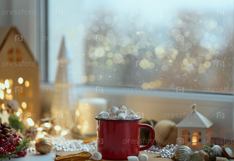 Уютная домашняя рождественская атмосфера, вид из окна, кружка горячего шоколада на подоконнике, вечер дома