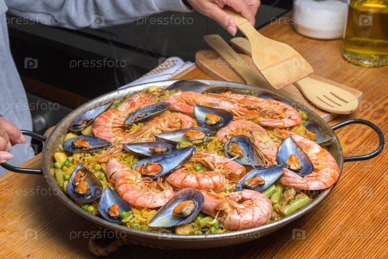 Традиционная испанская паэлья с креветками и мидиями в деревенской кухне, типичная испанская кухня, Майорка, Балеарские острова, Испания,