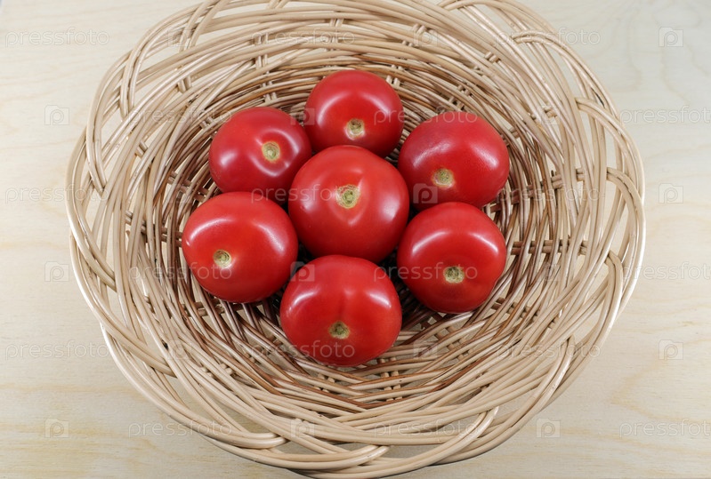 Сочные спелые красные помидоры в плетеной корзине на столе