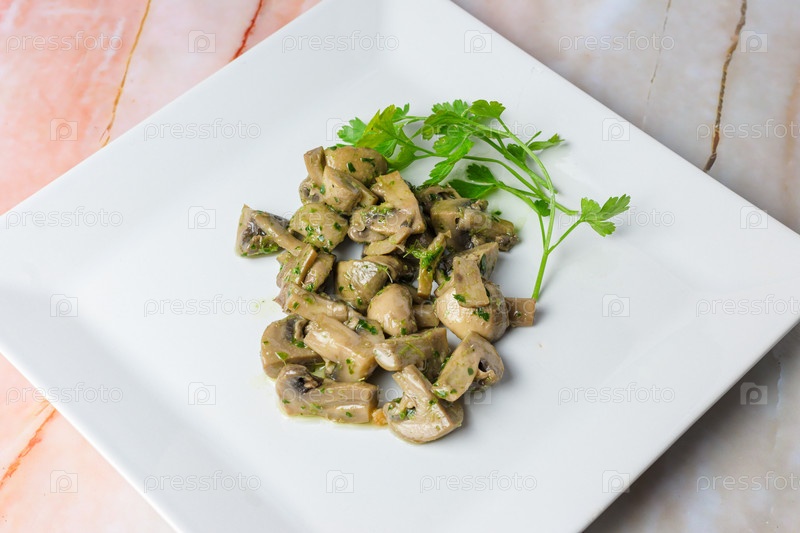 Маринованные в травах грибы с петрушкой на квадратной белой тарелке, типичная еда, типичная средиземноморская кухня Майорки, типичная для Балеарских островов Майорка, Испания,