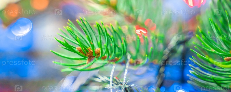 Яркая рождественская елка с украшениями и яркими огнями, мягкий фокус, размытый фон