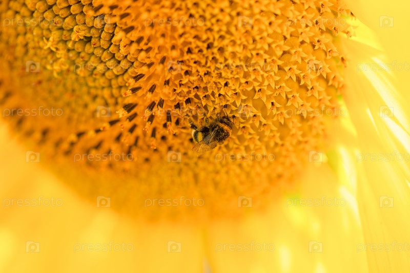 Милый мохнатый шмель сидит на подсолнухе в ясный солнечный день, позитивный образ