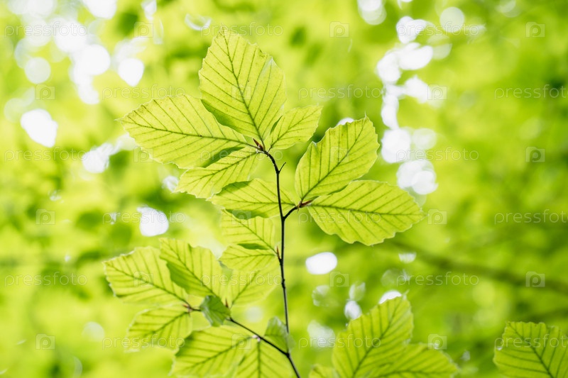 Ветви деревьев с зелеными листьями, вид снизу, размытый фон боке