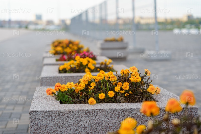 Желтые цветы на клумбах на тротуаре в городе