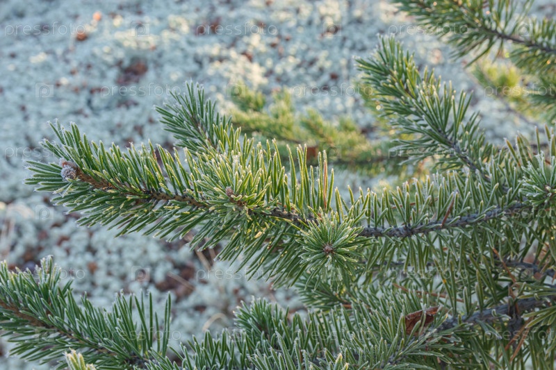 Ветви ели с зеленой жижей, покрытые влагами, на фоне мха северной тундры. Осенний природный натюрморт полярной флоры. Яркая палитра осенней сибирской тундры