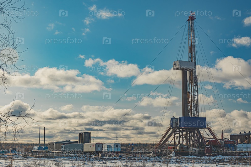 Гармоничное сочетание природы и техногенного ландшафта нефтегазового месторождения с буровой установкой и специальной техникой в полярной тундре