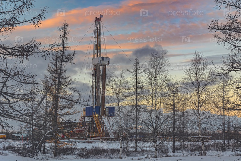 Зимний пейзаж нефтегазового месторождения с буровой установкой и специальным оборудованием в полярной лесотундре. Земля покрыта снегом