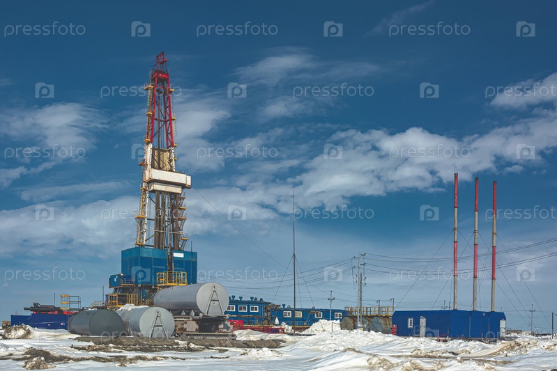 Общий вид буровой установки для бурения скважин на нефтегазовом месторождении в Арктическом регионе. Зима. День. Буровое оборудование и техническая инфраструктура
