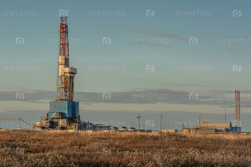 Общий вид буровой установки для бурения скважин на нефтегазовом месторождении в Арктическом регионе. Зима. День. Буровое оборудование и техническая инфраструктура