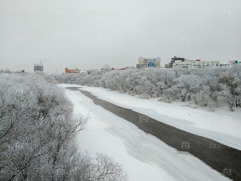 Вид на зимнюю реку Омь, протекающую через центр Омска, в окружении красивых деревьев, покрытых инеем