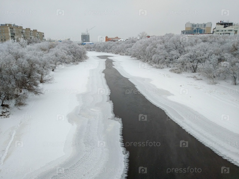 Вид на зимнюю реку Омь, протекающую через центр Омска, в окружении красивых деревьев, покрытых инеем