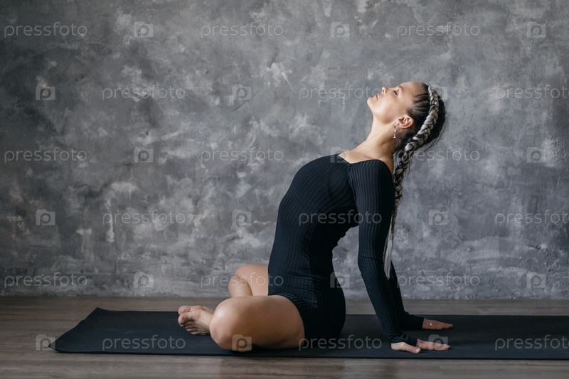 Привлекательная женщина, ведущая здоровый образ жизни, выполняет успокаивающие прогибы назад, заложив руки за спину, сидя на коврике, тренируясь в спортивной черной одежде возле стены