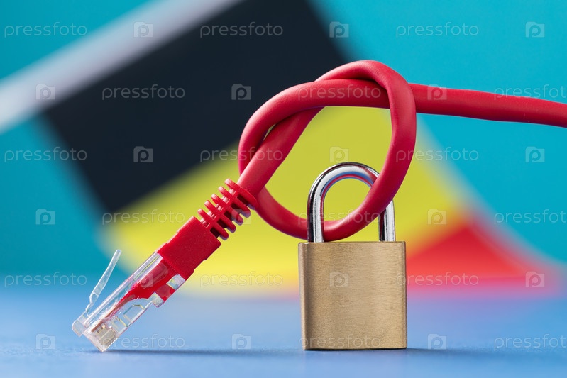 Закрытый замок на связанном сетевом проводе в узел на фоне бельгийского флага, концепция безопасности интернет-технологий в стране