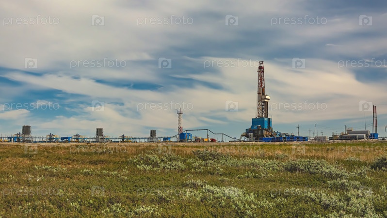 Весенний пейзаж арктической тундры на фоне инфраструктуры для бурения скважин и добычи нефти и газа. На переднем плане – скудная растительность северной природы. Красивое небо