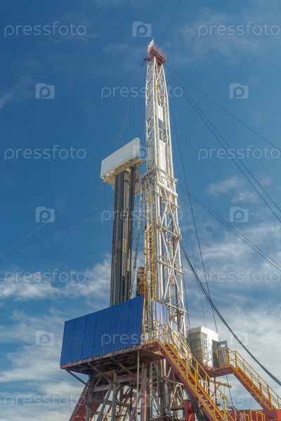 Проект буровой установки для бурения скважин на нефтегазовом месторождении на Крайнем Севере. Нефтяная вышка со стоячими бурильными трубами и оборудованием на фоне голубого неба