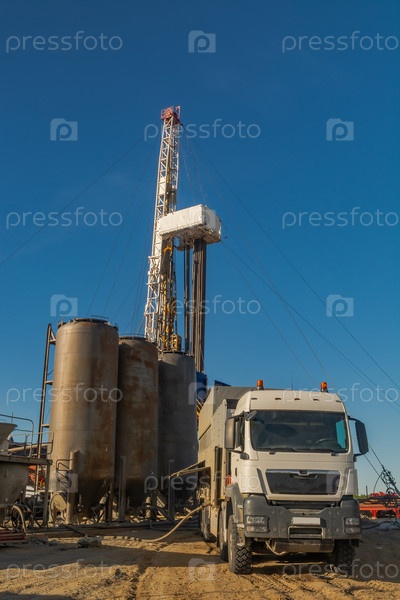 Буровая установка с оборудованием для цементирования скважин на переднем плане. Видна инфраструктура, средства связи и буровое оборудование. Цементировочный агрегат на автомобильном шасси. Резервуары для хранения цемента