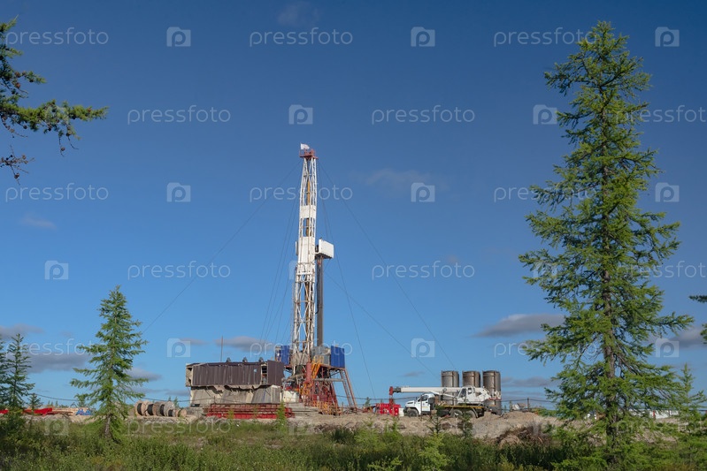 Пейзаж с буровой установкой на месторождении нефти и газа. Видна инфраструктура, средства связи и буровое оборудование. Вокруг буровой установки летняя северная тайга с зелеными деревьями и голубым небом