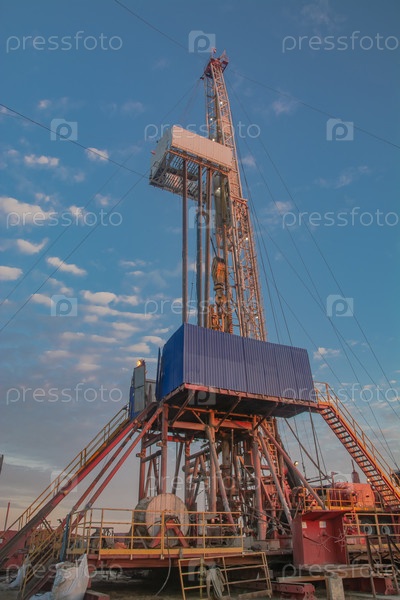 Проект буровой установки для бурения скважин на нефтегазовом месторождении на Крайнем Севере. Нефтяная вышка со стоячими бурильными трубами и оборудованием на фоне голубого неба