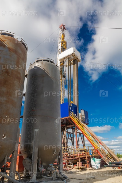 Буровая установка с оборудованием для цементирования скважин на переднем плане. Видна инфраструктура, средства связи и буровое оборудование. Цементировочный агрегат на автомобильном шасси. Резервуары для хранения цемента