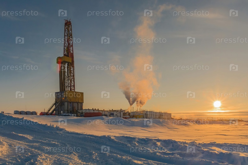 Бурение глубокой скважины для добычи нефти и газа на северном месторождении. Зимний полярный день. Низкое солнце освещает чистый снег арктической пустыни