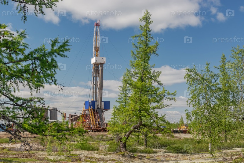 Пейзаж с буровой установкой на месторождении нефти и газа. Видна инфраструктура, средства связи и буровое оборудование. Вокруг буровой установки летняя северная тайга с зелеными деревьями и голубым небом