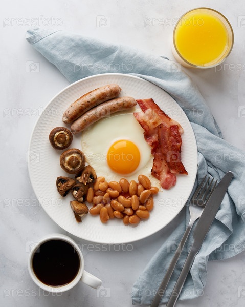 Вкусный английский завтрак. Вкусные грибы, жареные яичные желтки, фасоль, колбаски гриль, копченый бекон, свежевыжатый апельсиновый сок, чашка горячего кофе. Кетогенная еда на белом фоне