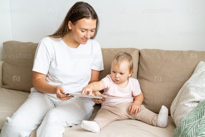 Улыбающаяся мать читает книгу с любопытной девочкой на диване в гостиной. Горизонтальный естественный свет