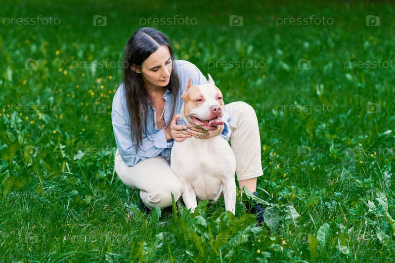 Женщина в повседневной одежде ласкает американского питбультерьера на траве. Счастливая собака с высунутым языком смотрит вокруг