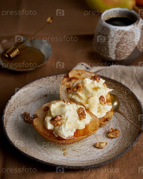 Вертикаль жареных груш с мороженым и грецкими орехами. Кофе и мед деревянного стола. Сладкий деревенский осенний десерт. Вид сбоку на половинки фруктов. Вкусная еда крупным планом