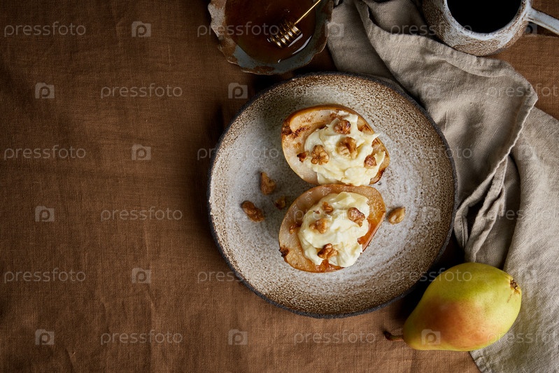Аппетитные сладкие груши по-деревенски, обжаренные сверху со сливками, медом и орехами. Чашка кофе и свежие фрукты на деревянной скатерти. Сладкий десерт осенью. Веган. Горизонтальное пространство для копирования