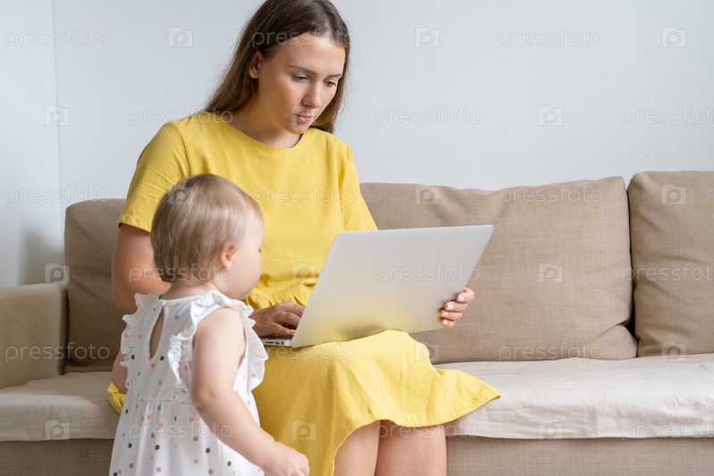 Блондинка в платье стоит рядом с матерью, сидящей на диване и смотрящей на экран ноутбука. Любопытный малыш отвлекает мать от работы дома. Концепция проблем удаленной работы