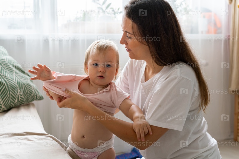 Симпатичную девушку одевает няня дома. Маленькая блондинка с голубыми глазами смотрит в камеру