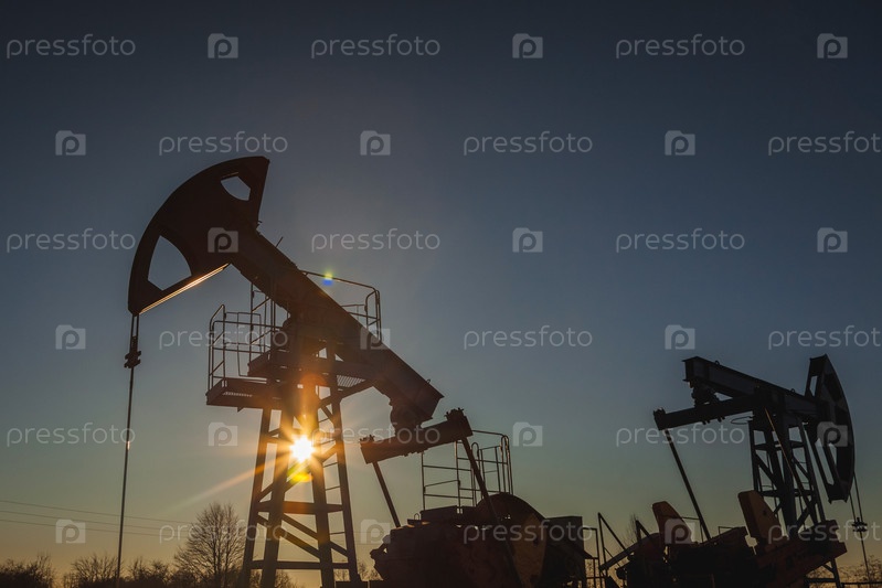 Масляный насос на фоне голубого неба и утреннего солнца, солнечные блики на масляном насосе