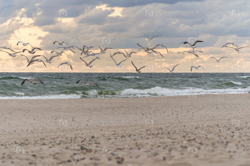 Песчаный осенний пляж, волны на море и облака на заднем плане
