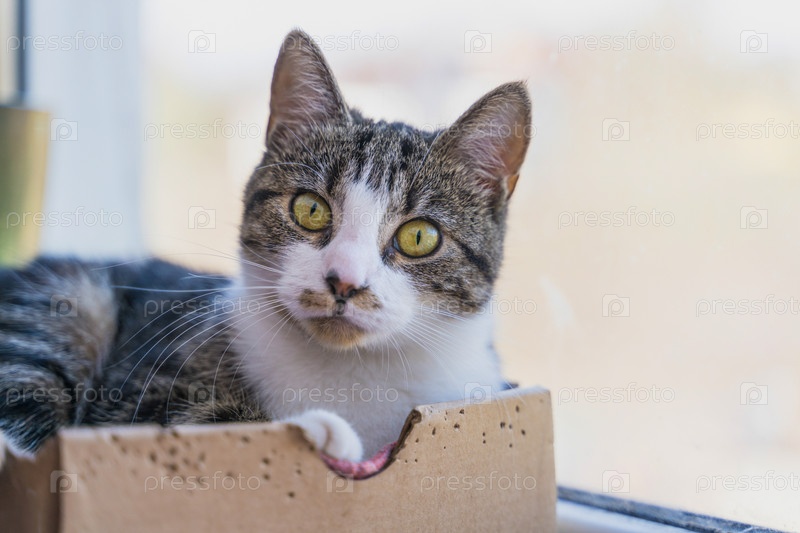 Кот лежит в коробке на подоконнике
