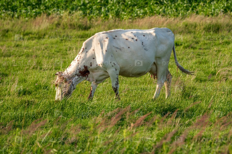 Коровы пасутся на сочном лугу в летний день