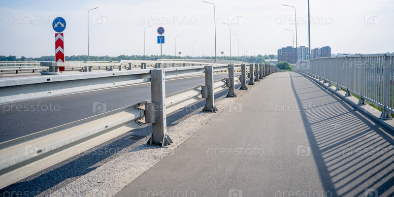 Проезжая часть моста с металлическими перилами высотных зданий на заднем плане