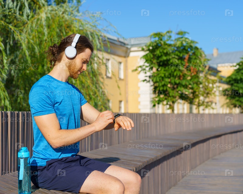 Вид сбоку на молодого человека, проверяющего пульс на умных часах, сидя на скамейке в парке и отдыхающего после утренней пробежки на свежем воздухе, спортсмена в спортивной одежде, использующего фитнес-приложение во время тренировки на открытом воздухе