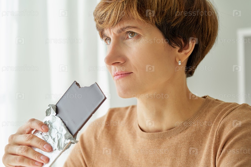Кавказская женщина средних лет кусает шоколад, но у него нет вкуса. длительный симптом covid19. потеря вкуса к еде. утрата обоняния как одно из долгосрочных последствий sars-cov-2